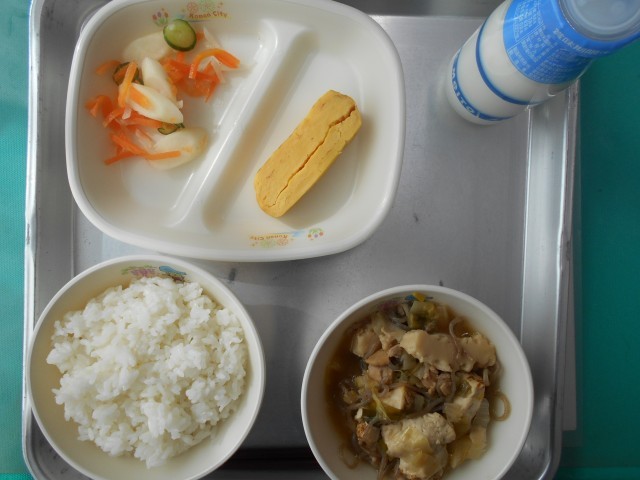 ごはん ぎゅうにゅう あつやきたまご ひきずり もりぐちだいこんのあえもの エネルギー657kcal