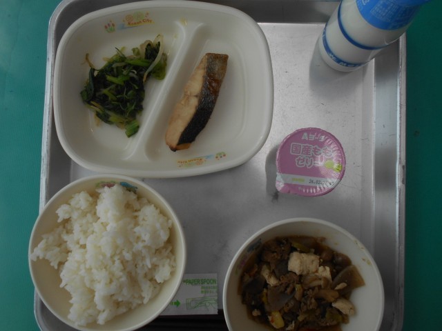 ごはん ぎゅうにゅう さけのつけやき いもに おかひじきのおひたし ももゼリー エネルギー593kcal