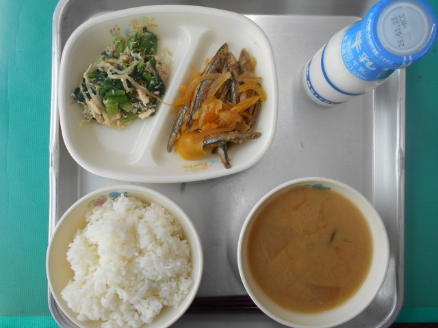 ごはん ぎゅうにゅう きびなごのなんばんづけ こまつなのささみあえ ごじる  エネルギー587kcal