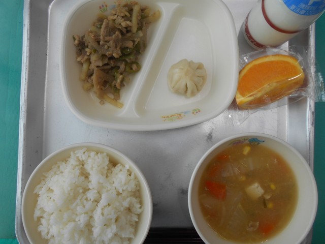 ごはん ぎゅうにゅう ショーロンポー じゃがいもとレンコンのチンジャオロース ちゅうかコーンスープ オレンジ エネルギー628kcal