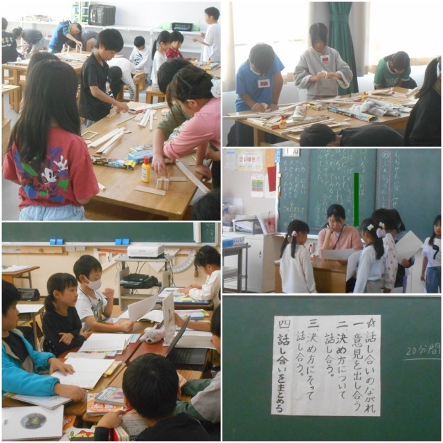 4年生図工「のこぎりギコギコ」では、のこぎりの安全な扱い方を知り、木を思いのままに組み合わせたりして、想像をふくらませていました。