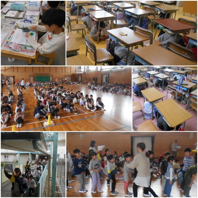 地震を想定した避難訓練を行いました。机の下に潜ったり、静かに体育館に避難したりしました。避難経路の確認と様々なケースで命を守る手段について考えました。