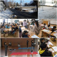 登校時には、校庭に1㎝ほどの積雪がありましたが、日差しが降り注ぎ、昼前にはほぼ溶けています。運動場での活動も通常通り行えています。 3年生図工「いろいろうつして」では、いろいろな形の材料(片面波段...
