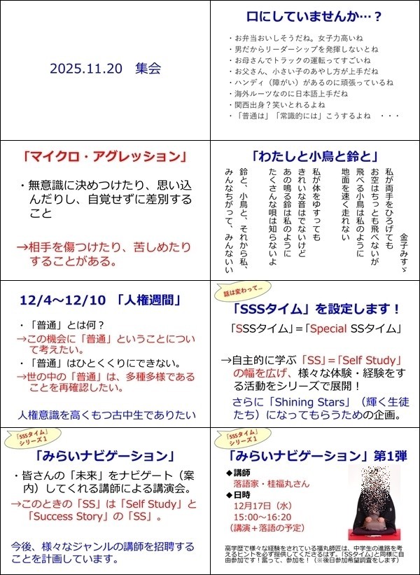 ぜひ、そんな感覚を身につけ、人権意識を高くもつ古中生であってください。