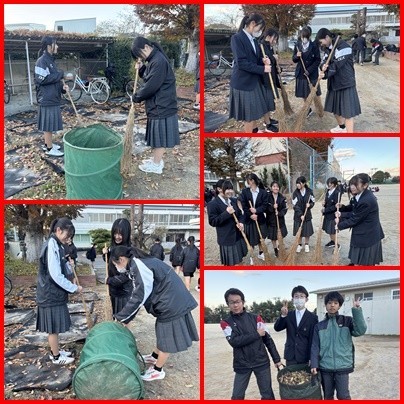 授業後には、有志の生徒で結成された「落ち葉掃き隊」(落ち葉掃きたい!)が集まって、学校や学校周辺の落ち葉掃きを行いました。