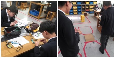 写真は、現在2年生が実施している、技術科の授業のワンシーンです。はんだごてを用いて制作し、右の写真のように、有線のコントローラーで動く、「ロボットの簡易版」のようなものを作製しています。