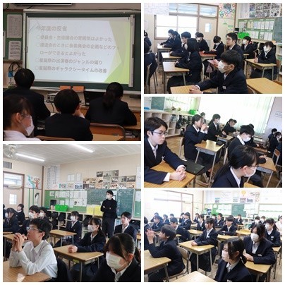 各委員会ごとに本年度の課題と改善点を発表し、全校生徒に共有するという時間でした。