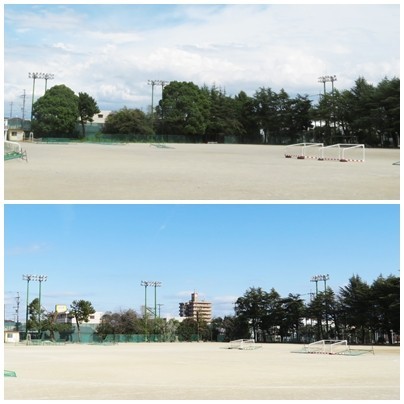 これは、記事でもお伝えしたように、地域にご迷惑をおかけしていた落葉等を減らすための措置ですが、これらの樹木は、運動場の砂が敷地外に舞わないような「防砂林」的な役目を果たしていたこともあります。そこで、砂がしっとりするように、昨日、運動場に「にがり」(塩化カルシウム)を撒まきました。そして、運動場になじむように、散水を施しました。