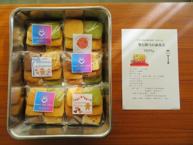 日曜日の本HPの記事(【家庭科部】箏曲部演奏会にて100名分のお菓子を提供しました)にあったように、今年度、箏曲部が出演する「ひなまつり演奏会」に、「友情アシスト」として、家庭科部とのコラボレーションが実現しました。
