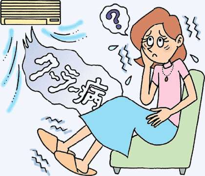 クーラー病という病気を知っていますか。人には本来、環境に適応する力が備わっていますが、クーラーという人工的なものの影響で、人の体温調節能力がくるってしまい、さまざまな症状を引き起こす病気です。体の冷え、だるい、食欲がない、頭痛、腹痛、下痢などで、夏バテの原因にもなります。冷房のきいた部屋に長時間いる行為は体に優しくありません。クーラーの温度は27度前後にしましょう。冷風を直接体に当てないようにし、夜寝るときはタイマーにするなど工夫しましょう。お風呂にゆっくり入るのはクーラー病の予防に効果的です。