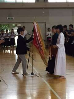 開会式の様子です。昨年度の優勝旗と準優勝盾を返還しました。また女子主将の中村さんが選手宣誓を行いました。いよいよ男子の団体が始まります。