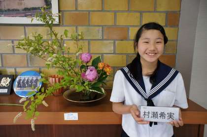 茶華道部による5月の玄関のお花は、2年1組村瀬希実さんの作品です。
