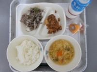 本日の献立は、ご飯、牛乳、厚揚げ豆腐の肉みそあん、大根と野菜の煮物、きゅうりのごまじょうゆ でした。