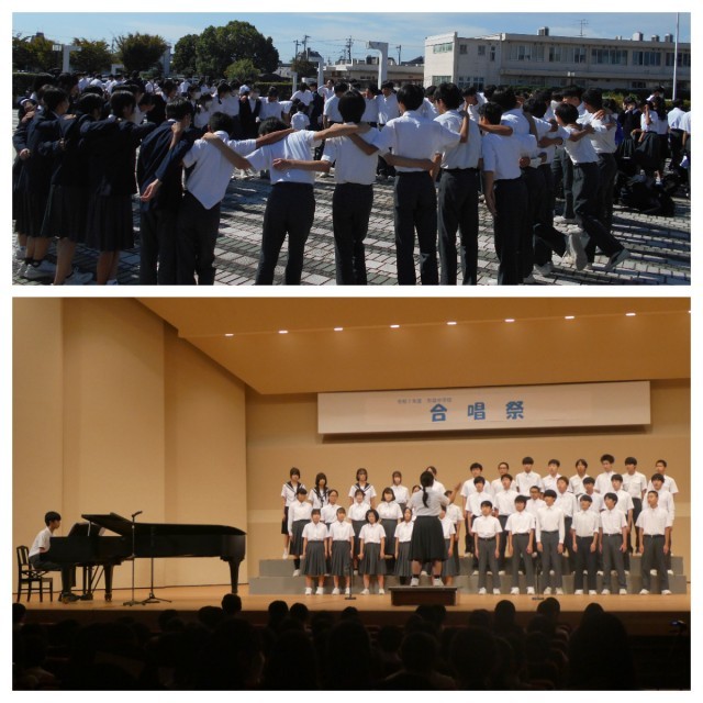 2年生の合唱祭は、青空のもと、朝から張り切って声出しをし、本番も練習の成果を発揮することができました。どのクラスも2年生らしく、昨年より難易度の上がった合唱曲を自分たちなりに工夫し、表現することができました。この合唱祭を通してさらに深まった仲間との絆を、これからの行事にも生かして頑張っていきましょう。