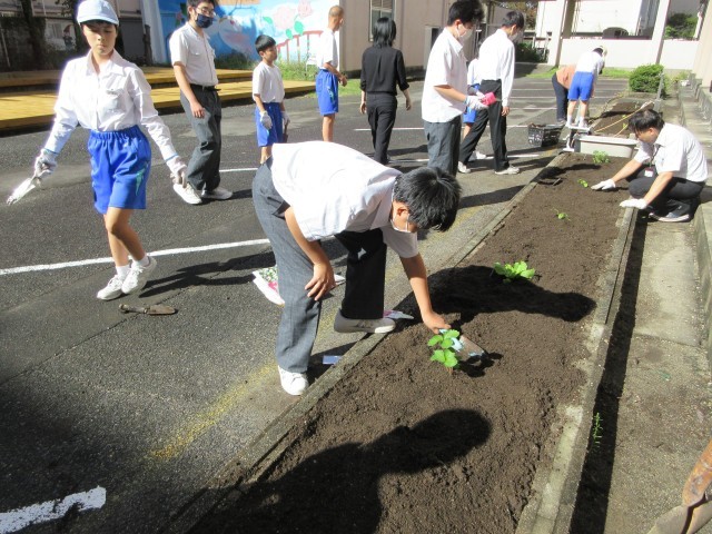 今日は、生活作業の時間に冬野菜を植えました。生徒たちから冬野菜には何があるかを調べてもらって、その中で選んだ野菜たちです。これから、観察日記をつけながら、野菜の成長を楽しみ、収穫まで、お世話を頑張ってもらいたいです。