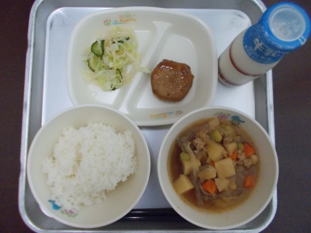 本日の献立は、ご飯、牛乳、野菜つくね、じゃがいものそぼろ煮、たくあん和え でした。