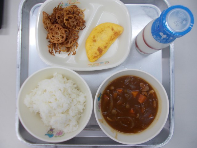 本日の献立は、ご飯、牛乳、ハッシュドポーク、オムレツ、れんこんチップス でした。