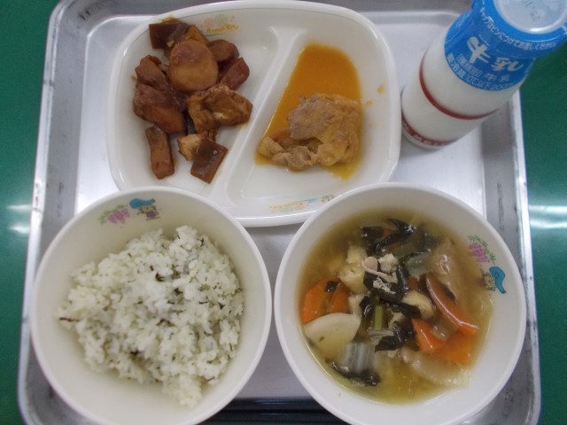 本日の献立は、あいちの大根菜ご飯、牛乳、鶏肉の蒲郡みかんだれ、八丁みそ煮、愛知野菜のとろみ汁 でした。