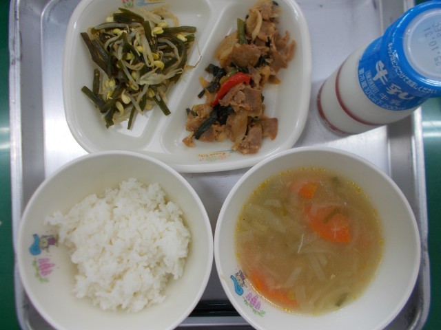 本日の献立は、ご飯、牛乳、プルコギ、大豆もやしのナムル、サムゲタン風スープ でした。