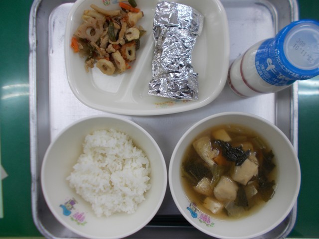 本日の献立は、ご飯、牛乳、たらのみそマヨホイル焼き、五目きんぴら、えび団子汁 でした。