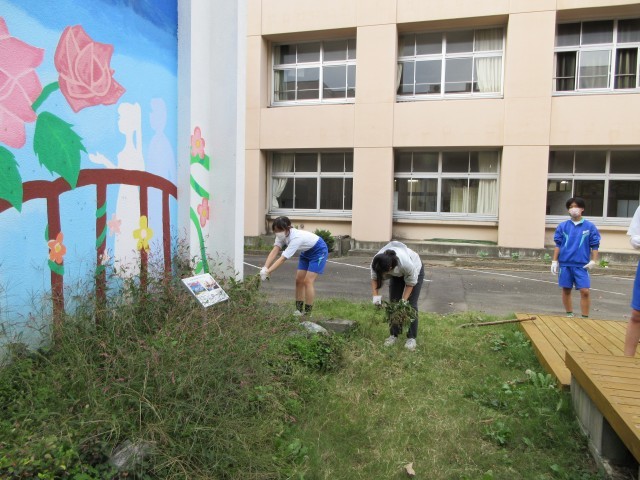 緑化委員会は、本日、中庭の花壇の草抜きをしました。ハッピーガーデンの前は、草の根が深く、かなりの力が必要でした。バッタや青虫などもたくさん住んでいました。みんな頑張ってくれて、草だらけの花壇が見違えるようにきれいになりました。生徒たちの力は本当に偉大です。みんなで協力して、きれいになった花壇に目をむけてくれるとうれしいです。