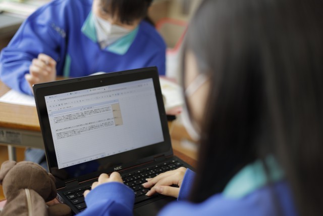 3年生の国語の授業では、「複数の意見を読んで、考えよう」の単元を学習しています。筆者の「論理の展開」や「提言」について、自分なりの評価とその評価をつけた理由を考えます。その後、クラス内でそれらを共有し、様々な考え方に触れました。