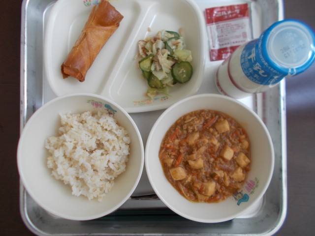 本日の献立は、玄米ご飯、牛乳、春巻、マーボー豆腐、中華和え、ココア牛乳のもと でした。