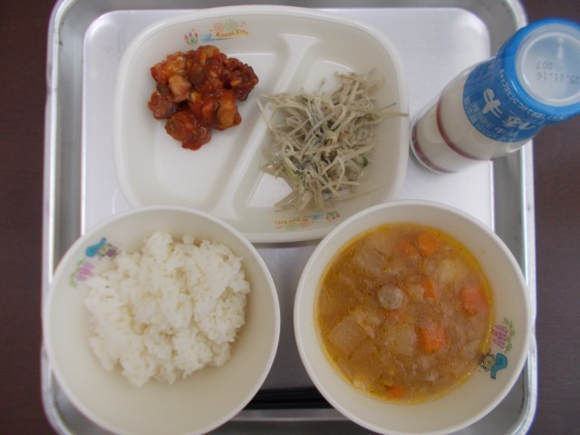 本日の献立は、ご飯、牛乳、さけのトマト煮、和風ポトフ、ごぼうサラダ でした。