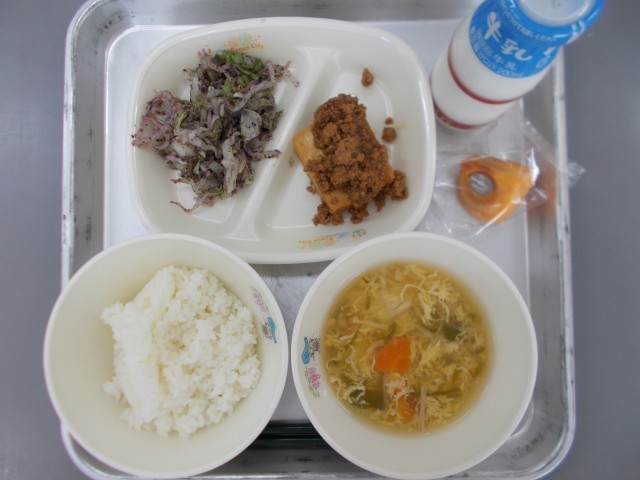 本日の献立は、ご飯、牛乳、生揚げのみそだれかけ、赤じそ和え、かきたま汁 でした。