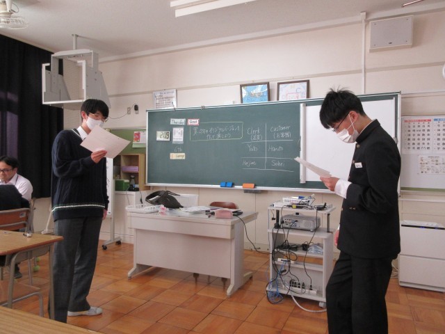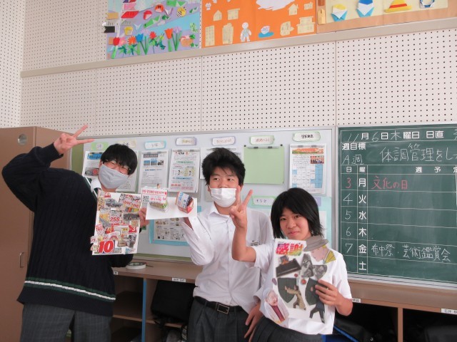 2時間目、3時間目は外部から色々な方が来られて、生徒たちの授業の様子をみて頂きました。生徒たちは、いつも通り、頑張っていました。授業を通して、人の話を聞く姿勢について考えました。5時間目、英語の授業では、買い物をする場面を店員と買う側とで、なりきって演じている場面です。明日は布袋中祭です。どんなパフォーマンスがみられるのか、楽しみです。