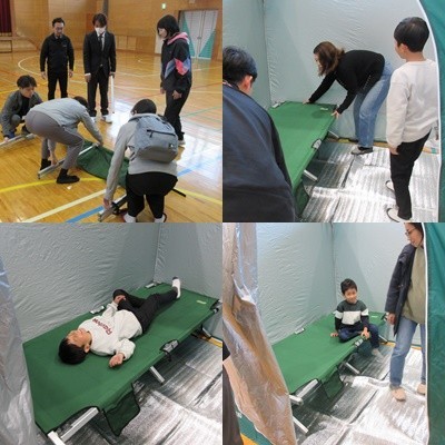 前半は「3人用の簡易テント」と「簡易ベッド」を組み立て、意外と狭いことやベッド数に限りがあることなどを学びました。