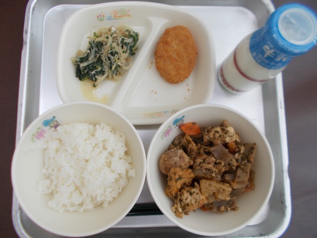 本日の献立は、ご飯、牛乳、まぐろカツ、静岡おでん、ほうれんそうと桜えびの和え物 でした。