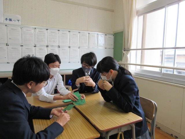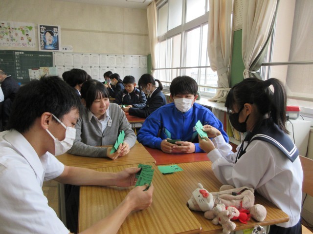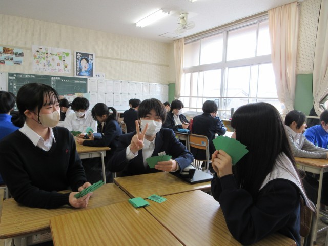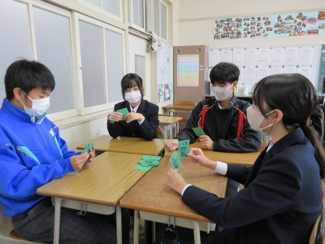 マイケル先生の授業の様子です。来週の定期テストに向けて、関係代名詞の復習をしました。前半はマイケル先生が行ったことを英語で表現しました。後半はグループでカードゲームをしながら、英語の習得をめざしました。勝ち負けが重要ではなく、カードに書かれた英語を発音しながら、英語を習得していきます。裏面は、関係代名詞を使った並び替え問題などがあります。時間内にできなかったので、是非、裏面にも取り組んで、関係代名詞を習得してください。
