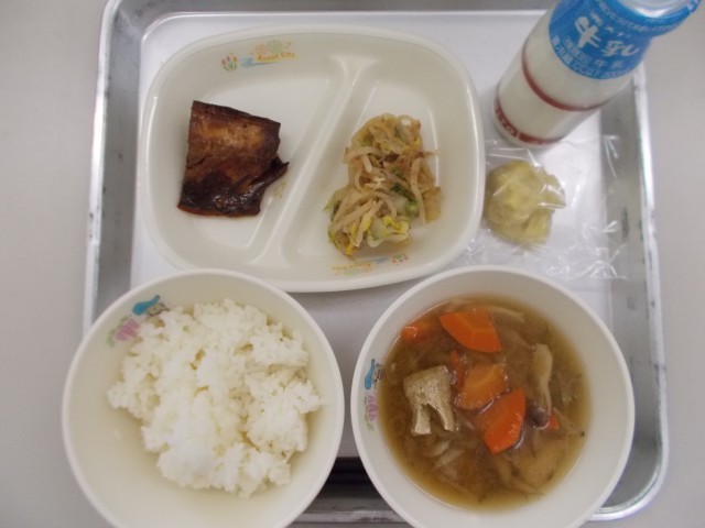 ご飯、牛乳、さばの八丁みそ煮、白菜のおかか和え、大根のすりながし汁、おにまんじゅう でした。