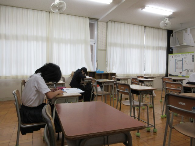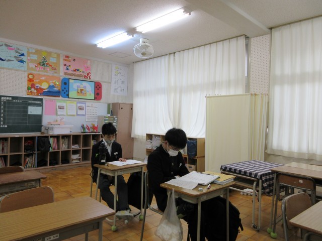 1時間目、自習の時間の様子です。今日は、理科、数学、社会のテストが行われます。授業で扱ったプリントを復習するなど各自で勉強しています。交流級でテストを受けている生徒もいます。