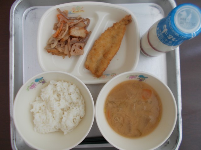 本日の献立は、ご飯、牛乳、にぎすフライ、れんこんのきんぴら、ご汁 でした。