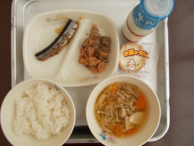 本日の献立は、ご飯、牛乳、さんまのおろし煮、吹き寄せ煮、ふだま汁、お米のタルト でした。
