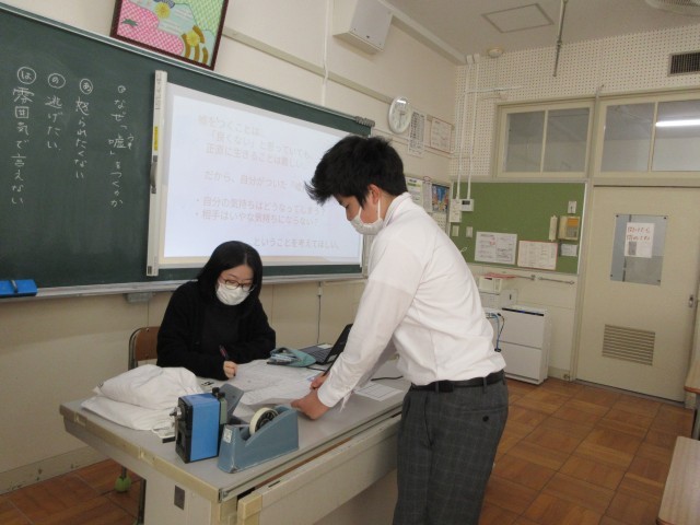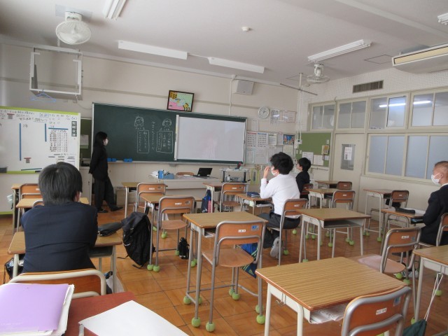 道徳の授業の様子です。今日の題目は「ウソ・ウソ・ウソ」です。授業者は、あなたは「ウソ」をついたことがありますか。との質問から始まり、何で「ウソ」をつくのか。その時の気持ちはどうか。と生徒に問いかけました。生徒たちの意見を聞きながら、授業をすすめていきました。最後に谷川俊太郎の言葉を引用して、授業を終えました。