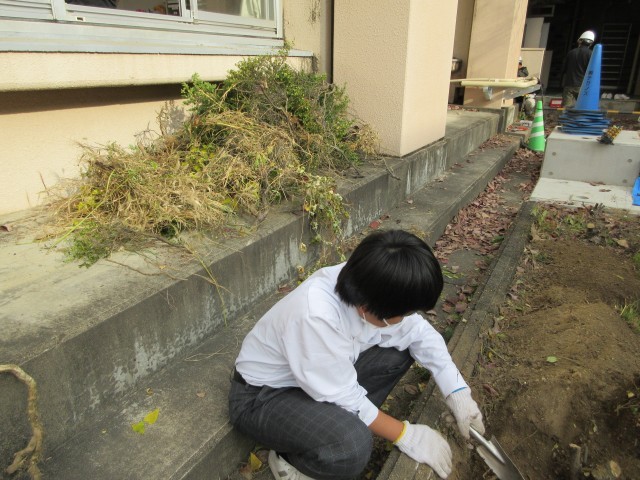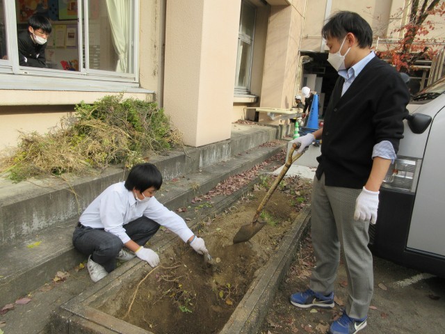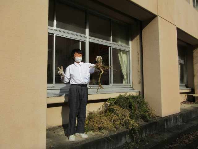 1時間目、生活作業の時間に畑にチューリップの球根を植えました。それと同時にとなりの植木を抜いて、畑を広げる計画です。根っこが深く張っていて、なかなか抜けません。昼休みに引き続き、作業をして、やっとひとつ抜けました。まだもう少し時間がかかりそうです。