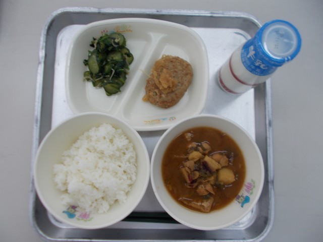 今日の献立は、ご飯、牛乳、ハンバーグのおろしソース、青菜のしらす和え、さつま汁 でした。