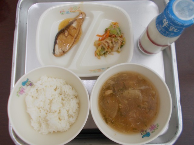 本日の献立は、ご飯、牛乳、ぶりの照り焼き、白菜とえのきのおひたし、かぶといももちのとろみ汁 でした。