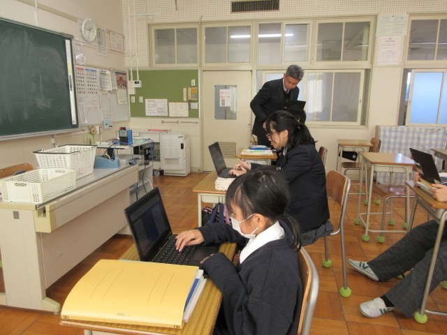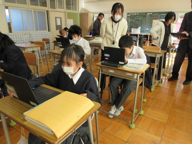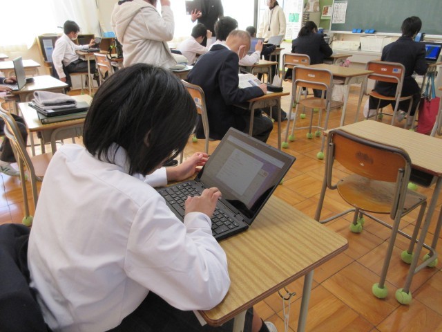 続いて6枚目からは社会の授業の様子です。今日は、日本地図を共有してクロームブックで自分が行ってみたいところを日本地図に写真をいれて示していました。みんなで共有できるので、だれが投稿したのかもわかります。とても楽しそうに活動していました。