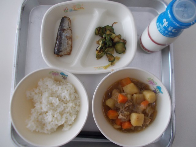 本日の献立は、ご飯、牛乳、いわしのしょうが煮、肉じゃが、塩昆布和え でした。