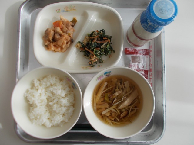 本日の献立は、ご飯、牛乳、栄養まんてん!チキン炒め、春菊と油揚げのごま和え、沢煮わん、ココア牛乳のもと でした。