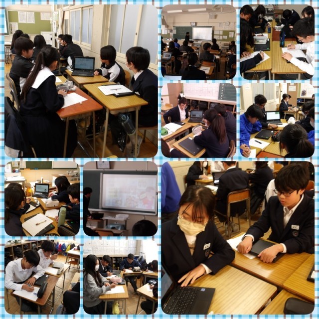 1年生は今日も元気に過ごしていました。探究学習の時間では、探究した成果をまとめ、発表をしました。