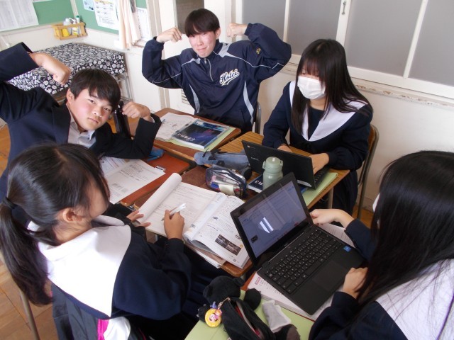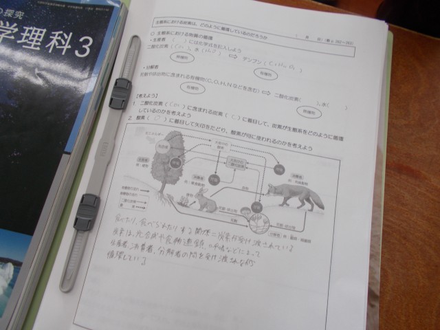グループで話し合いながら生物と環境の関わりについてまとめ学習を行いました。