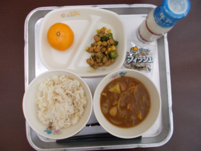 本日の献立は、玄米ご飯、牛乳、ポークカレー、ひよこ豆のバター炒め、みかん、乾燥小魚 でした。