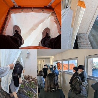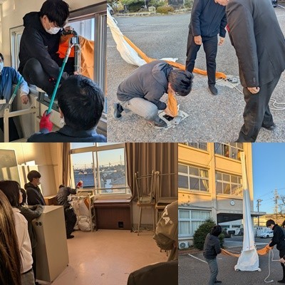 来週の避難訓練に向けて、救助袋を展開して、実際に設置や降下をしながら使い方の確認を行いました。スムーズな設置や降下には大変時間がかかることが分かりました。(慣れた人で設置に5分程度、降下に1人1分程度)