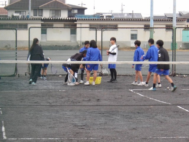 雨が降った後のテニスコートですが、たくさんの部員が熱心に練習に参加しています。