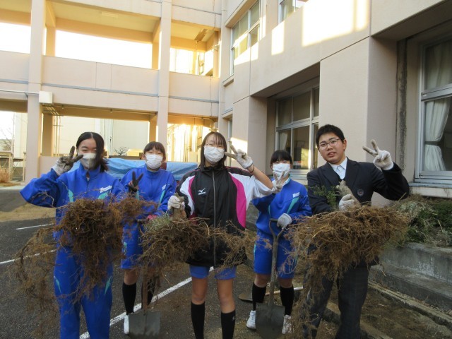 今日のST後に、3年生の有志で1年1組前の畑整備をしました。短い活動でしたが、大きな根っこを4本抜きました。みんなの笑顔が素敵です。